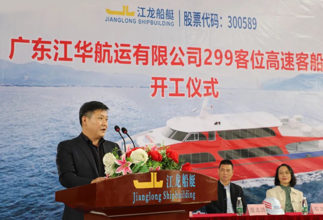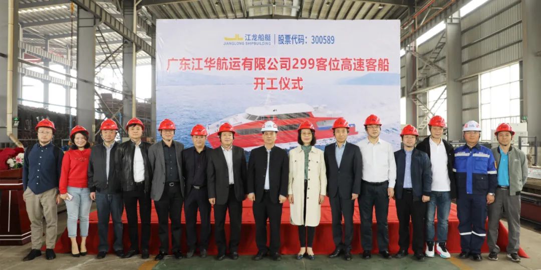 近日,广东江华航运有限公司299客位高速客船开工仪式在江龙船艇(股票代码:300589)中山科技园举行,惠嘉交通集团董事长、广东江华航运有限公司董事邓文玉,广东蓝海豚旅运股份有限公司董事陈杰、副总经理周雄,广东江华航运有限公司总经理刘青平,中国船级社实业有限公司广州分公司副总经理许明以及江龙船艇董事长兼总经理晏志清、董事兼副总经理贺文军等出席仪式。