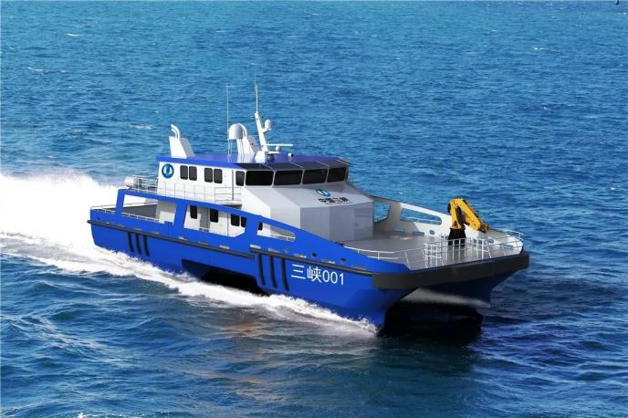 这艘由子公司澳龙船艇承建的三峡新能源30米级全铝合金风电运维船是国内第一艘小水线面铝合金风电运维船,总长32.5米,型宽11.6米,型深5.3米,设计航速不小于20节,具有快速性、耐波性等优势。