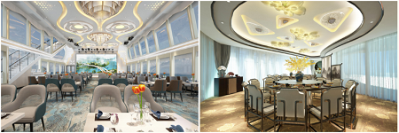 本船设计根据旅游景区的文化特色量身定制,采用全通透式新颖双体船型设计,融合时尚通透元素与游船观光休闲元素,以玻璃幕墙结构和双体船型设计出造型新颖、更具现代气息的玻璃游船,向旅客全方位展现江河两岸。内装采用超现代简约手法,极简科技风,曲线造型营造温馨动感空间。