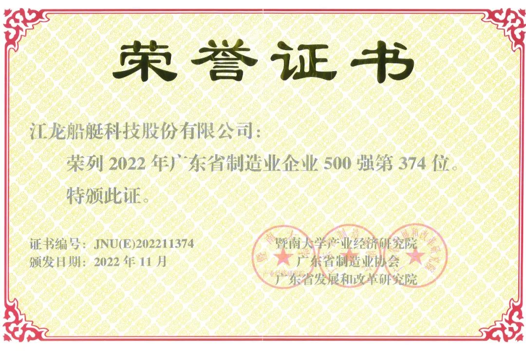 近日,由暨南大学产业经济研究院、广东省制造业协会及广东省发展和改革研究院联合主办的“2022广东省制造业发展年会暨广东省制造业500强企业峰会在广州隆重举行。作为粤港澳大湾区的船艇制造企业,江龙船艇(股票代码:300589)荣登2022广东省制造业企业500强榜单,彰显了江龙船艇在高性能船艇制造领域的实力与品牌影响力。