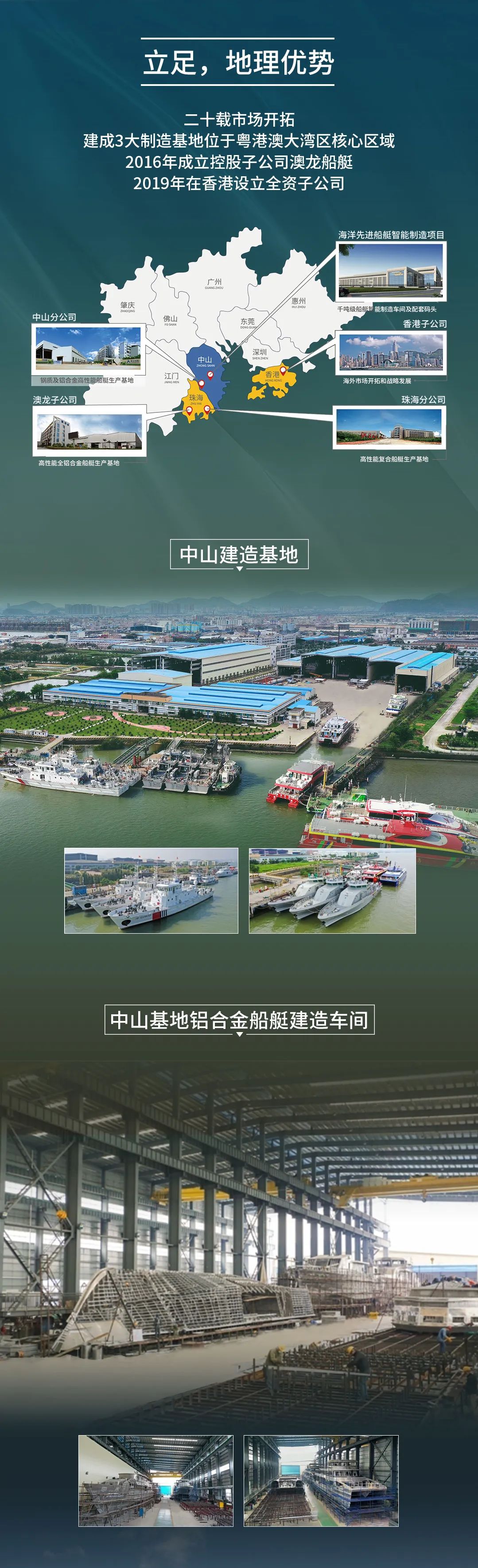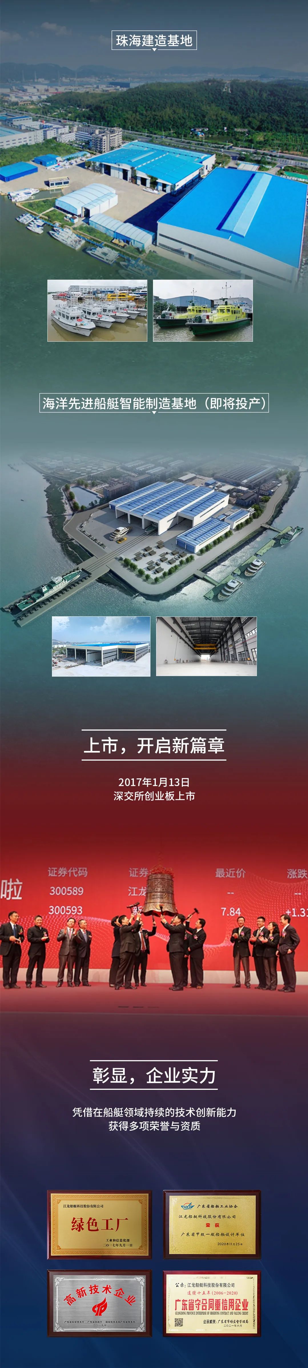 江龙船艇科技股份有限公司是A股上市企业,成立于2003年,旗下拥有中山分公司、珠海分公司、澳龙子公司、香港子公司,已形成公务执法、旅游休闲、特种作业和新能源船艇四大主营业务,是国内同时具备钢质、铝合金及复合材质船艇研发生产能力的中小型高性能船艇细分领域的领军企业。