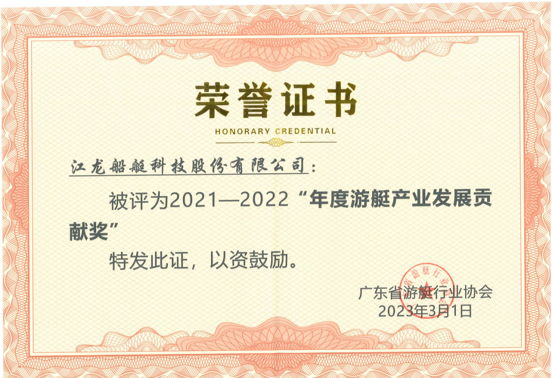 近日,江龙船艇(股票代码:300589)获评广东省游艇行业协会“年度游艇产业发展贡献奖”,肯定了江龙船艇在高性能船艇建造领域的实力,进一步提升了公司在粤港澳大湾区的品牌知名度和影响力。