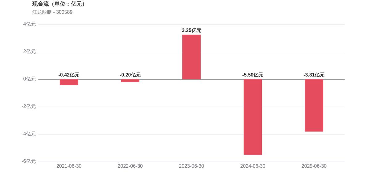 在经营稳健性方面,江龙船艇面临存货周转效率下降的压力,存货周转天数增至119.67天,较2024年上半年增长80.8%,表明公司库存管理和销售效率有待改善。经营活动产生的现金流净额为-3.81亿元,虽较2024年同期的-5.5亿元有所改善,但仍为负值,显示出公司现金流紧张状况尚未根本扭转。此外,2025年上半年的资产负债率为63.11%,同比增长5.35个百分点,这意味着公司债务负担进一步加重。