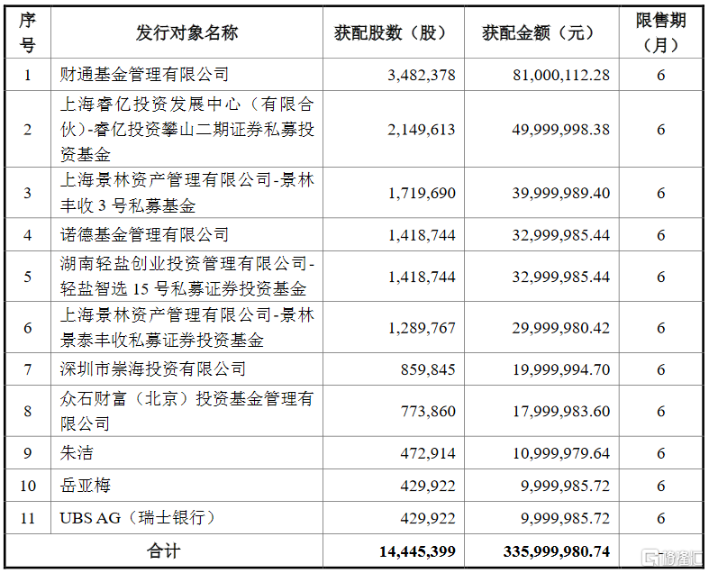 格隆汇8月20日丨移为通信(300590.SZ)披露向特定对象发行股票并在创业板上市发行情况报告书,确定此次发行价格23.26元/股,发行数量14,445,399股,募集资金总额约3.36亿元。此次发行对象最终确定为11家,此次发行配售结果如下: