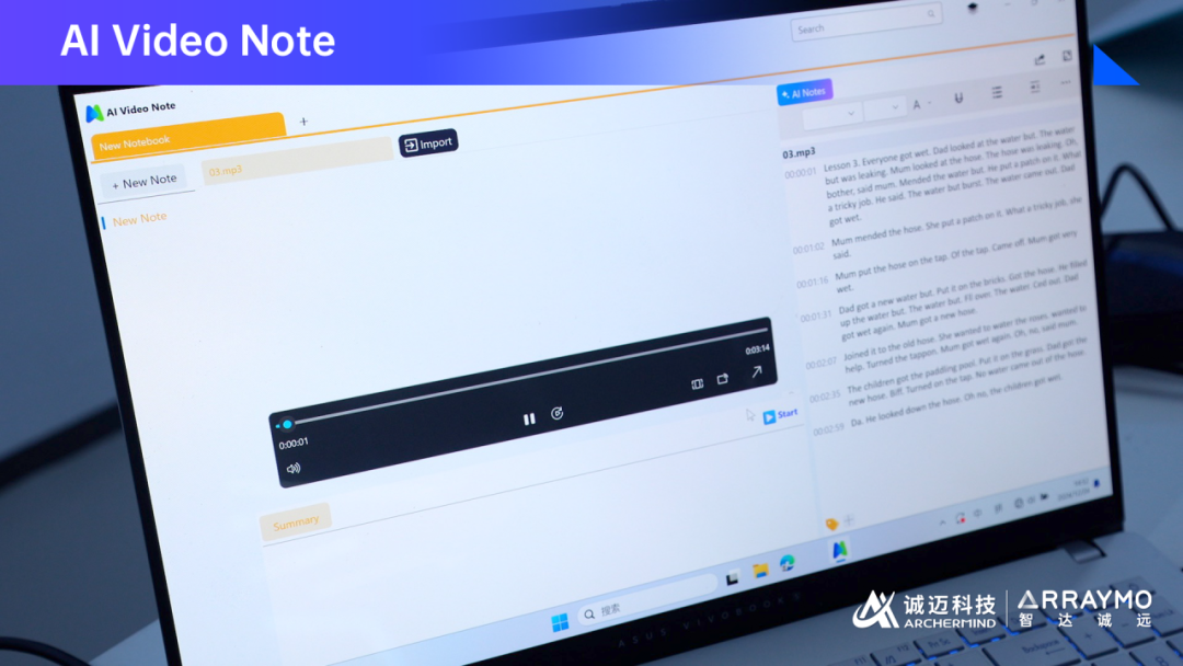 AI视频笔记解决方案:该方案以AI重塑传统视频制作的全流程,有四大主要功能:创建视频笔记、笔记编辑、AI分析视频和视频同步回顾。当用户上传音视频后,系统会自动使用本地大模型分析视频内容,生成文本笔记和摘要。这些文本笔记与视频同步,只要点击笔记中的任何一段文字,就能立即跳转到相应的视频部分,方便快捷地回顾和编辑相关内容。