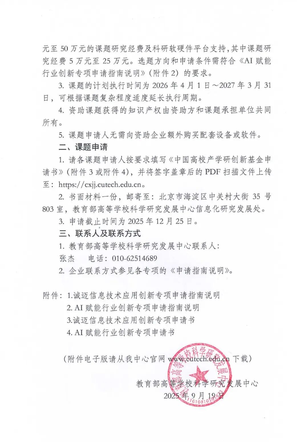 1.诚迈信息技术应用创新专项旨在推动高校将信创作为关键基座,充分运用于计算机、人工智能等相关专业建设中,进而赋能人才培养、教学改革、师生服务与科研创新,全面提升教育质量,促进高等教育变革。根据确定的研究内容,为每个立项课题提供总经费10万元至50万元的课题研究经费及科研软硬件平台支持,其中课题研究经费5万元至25万元。选题方向和申请条件需符合《诚迈信息技术应用创新专项申请指南说明》。