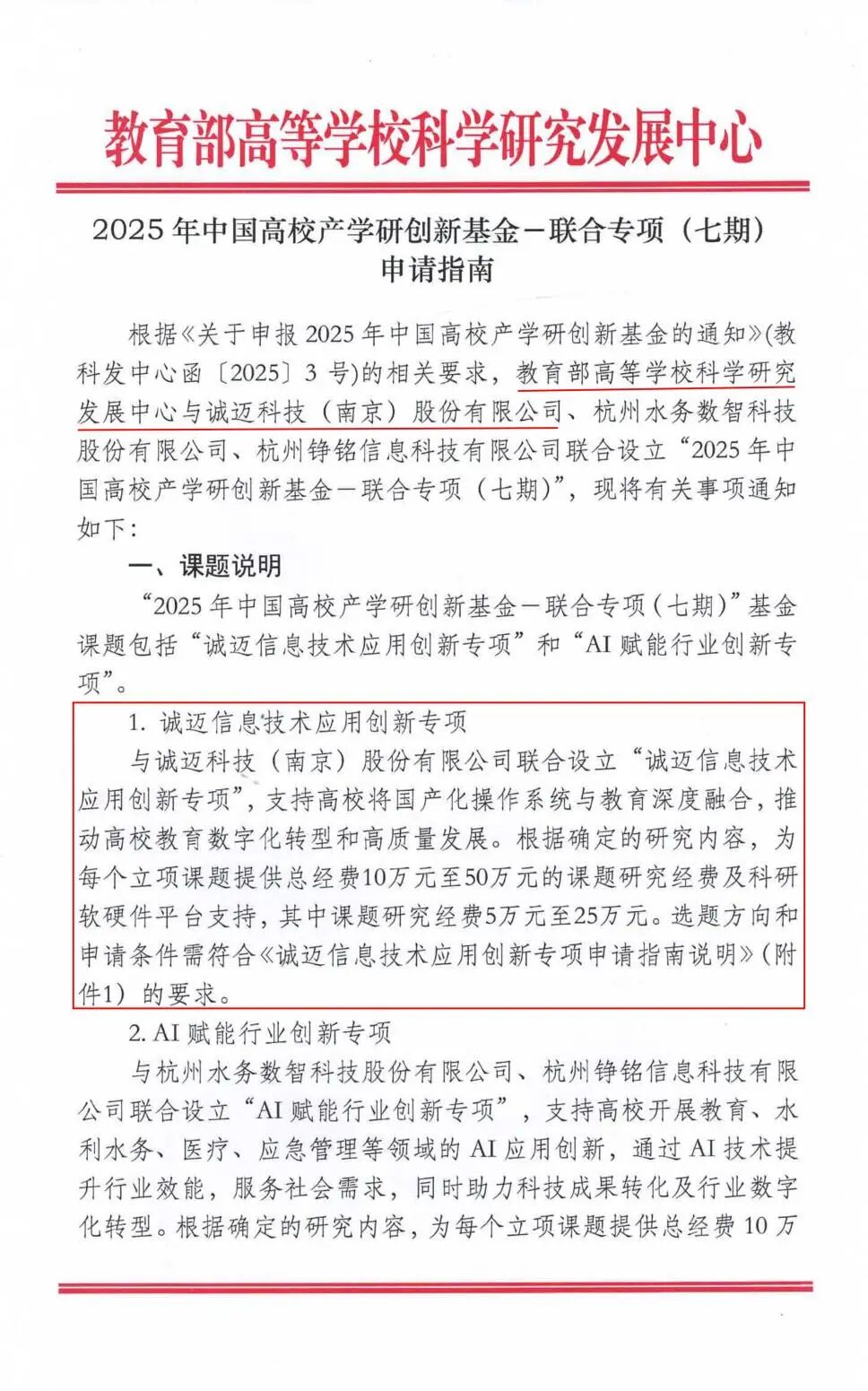 根据《关于申报2025年中国高校产学研创新基金的通知》(教科发中心函〔2025〕3号)的相关要求,教育部高等学校科学研究发展中心与诚迈科技联合设立“中国高校产学研创新基金-诚迈信息技术应用创新专项”,支持高校将国产化操作系统与教育深度融合,推动高校教育数字化转型和高质量发展。