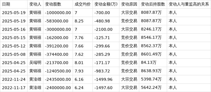深交所公开信息显示,5月19日,雄塑科技董事黄锦禧在竞价交易公司股票,减持股数58.30万股,成交均价8.25元,变动金额480.98万元,变动后持股数为8087.87万股。
