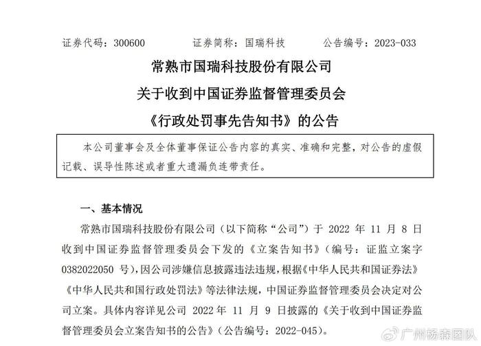 2023年9月8日,常熟市国瑞科技股份有限公司(简称公司或国瑞科技)公告称,收到中国证监会送达的《行政处罚事先告知书》。