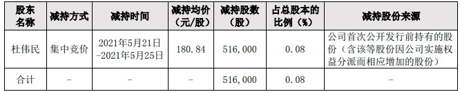 公告显示,控股股东杜伟民于2021年5月21日至2021年5月25日,减持公司股份51.6万股,占公司总股本比例的0.08%,减持方式为集中竞价。