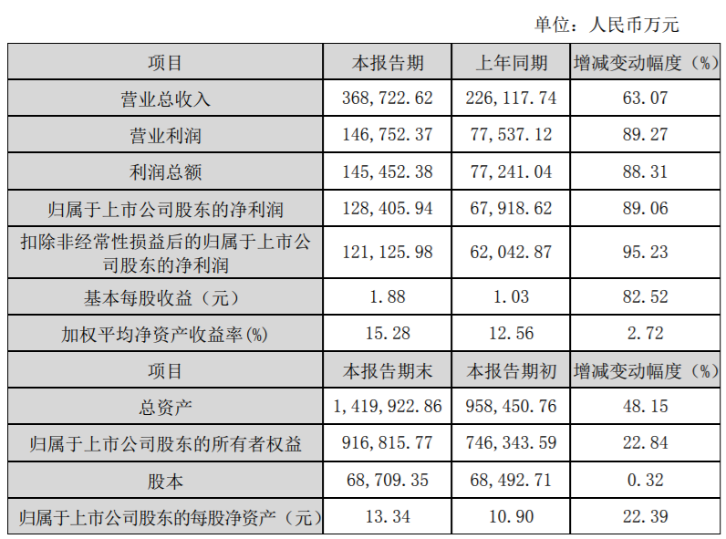 截至报告期末,公司总资产为1,419,922.86万元,同比增长48.15%;归属于上市公司股东的所有者权益为916,815.77万元,同比增长22.84%。公司总资产及归属于上市公司股东的所有者权益同比增长,主要是公司当期净利润增加、限制性股票解禁、股票期权行权及发行可转换公司债券所致。