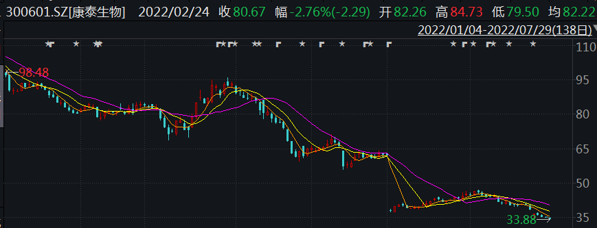 在二级市场,投资者对公司业绩“焦虑”已提前表现。截至8月2日,康泰生物股价收盘于32.27元/股(前复权,下同),总市值361.58亿元;较一年前股价高位下挫超六成,总市值缩水700亿元。且较2021年9月17日,公司实控人杜伟民提交倡议书、鼓励员工增持公司股票时的股价69.25元/股,也已腰斩。
