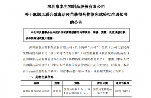 近日,深圳康泰生物制品股份有限公司(以下简称“康泰生物”)发布公告,公司全资子公司北京民海生物科技有限公司研发的麻腮风联合减毒活疫苗获得国家药品监督管理局出具的《药物临床试验批准通知书》,根据有关规定,经审查,本品符合药品注册的有关要求,同意进行临床试验。