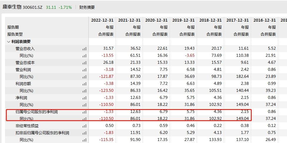 23日,康泰生物发布2022年年度报告。2022年,康泰生物实现营业收入31.57亿元,同比下降13.55%;归属于上市公司股东的净利润-1.33亿元,上年为盈利12.63亿元,同比下降110.50%;归属于上市公司股东的扣除非经常性损益的净利润-1.83亿元,上年同期为盈利11.91亿元。值得注意的是,Wind数据显示,这是康泰生物自2017年2月上市以来首次录得年度净亏损。