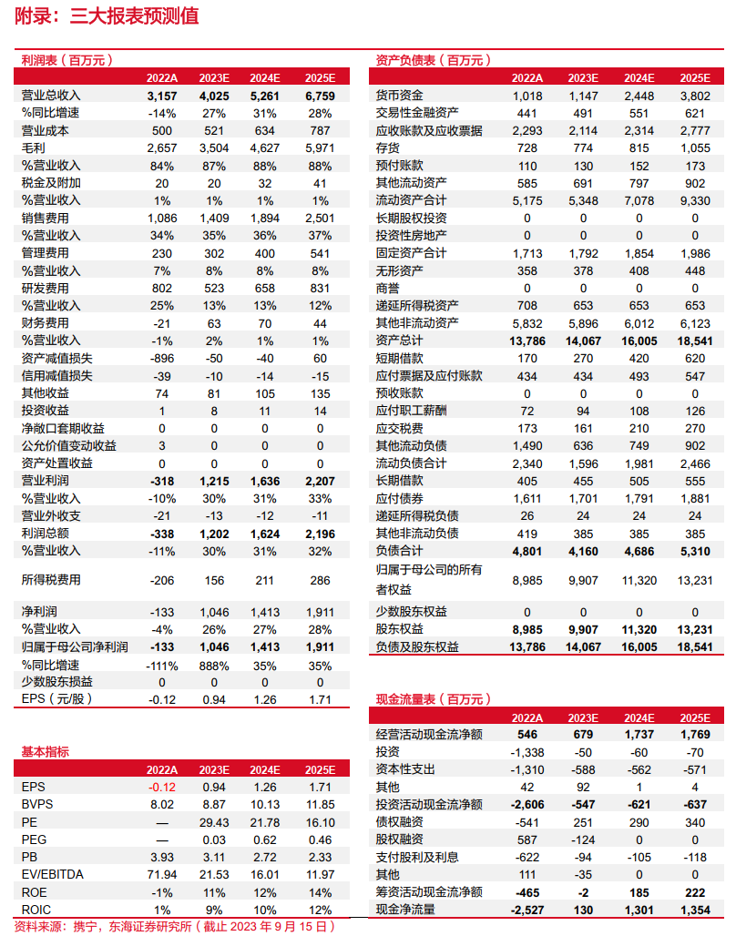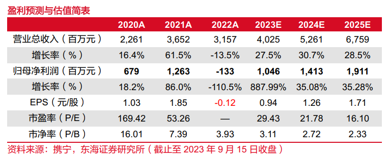 投资建议:我们预计公司2023-2025年实现营收40.25亿元、52.61亿元、67.59亿元,实现归母净利润10.46亿元、14.13亿元、19.11亿元,对应EPS分别为0.94/1.26/1.71元,对应PE分别为29.4倍/21.8倍/16.1倍。维持推荐,给予“买入”评级。