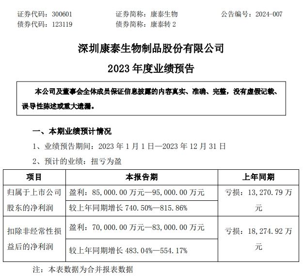 1月9日晚间,免疫治疗概念股康泰生物(300601)发布业绩预告,预计2023年净利润8.5亿元~9.5亿元,上年同期亏损1.3亿元,净利润同比增长740.50%~815.86%,实现扭亏为盈。