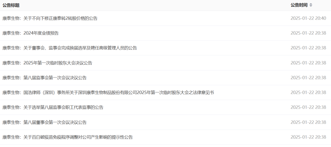 2025年1月22日,康泰生物发布2024年度业绩预告,关于董事会、监事会完成换届选举及聘任高级管理人员,关于百白破疫苗免疫程序调整对公司产生影响的提示性公告等多个公告。具体内容如下。