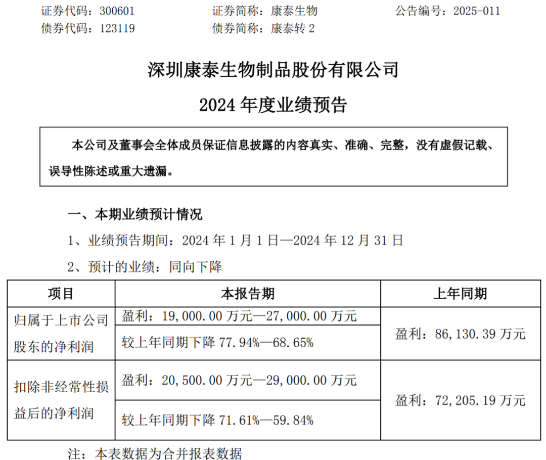 康泰生物预计公司2024年归母净利润1.9亿元-2.7亿元,同比下降77.94%-68.65%;扣除净利润2.05亿元-2.90亿元,同比下降71.61%-59.84%。