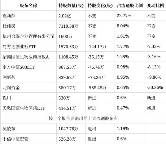 减持的股东中,易方达创业板ETF本期较上期自持股份减持7.33%至1570.53万股;招商国证生物医药指数A本期较上期自持股份减持3.16%至1108.45万股;南方中证500ETF本期较上期自持股份减持8.13%至867.55万股;北向资金本期较上期自持股份减持50.36%至580.17万股。