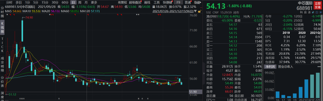 中芯国际自2020年7月16登陆上交所科创板,首日即创出了95元的历史新高,随后股价震荡回调,在2020年9月29日创始了49.45元的低点,随后展开一波反弹。今年的8月6日,曾创出74.9元的阶段高点,随后再度回调。8月6日至今,该股累积下跌19.45%。截至12月15日收盘,该股报54.13元,当前市值1961亿元。