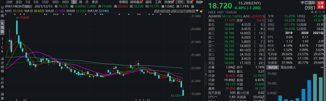 近两日,中芯国际H股连续大幅走低,昨日大跌近5%,今日跌6.4%,收报18.72港元。总体走势上来看,其H股和A股相当,8月6日以来,也走出一波回调行情,截至12月15日收盘,累积下跌32.9%。