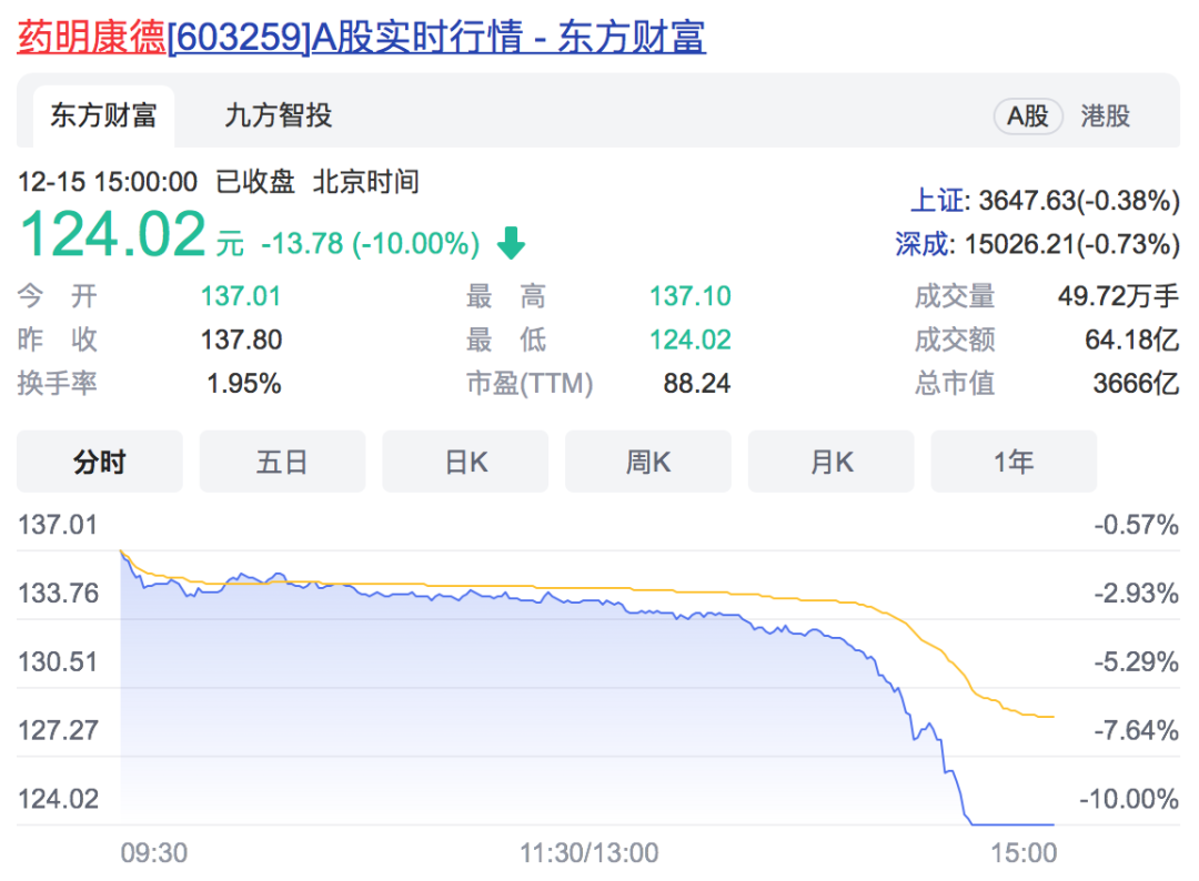12月15日午后,A股创新药板块大跌,Wind CRO指数收跌5.81%,15只成分股全线收跌。