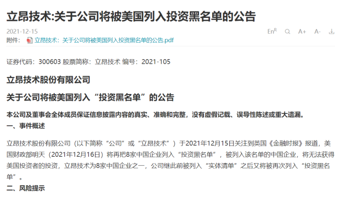 15日晚间,被列入“投资黑名单”的8加公司之一的A股上市公司公司立昂技术发布公告称,将被美国列入投资黑名单。公司业务并不涉及美国市场,公司云计算、大数据及智慧城市的平台和中台均为公司自主研发,公司将被美国列入“投资黑名单”的事件,并不会对公司正常经营以及对所有客户提供的产品及服务产生重大影响,对公司业绩也不会产生不良影响。