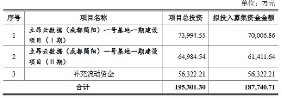 本次发行募集资金总额不超过187,740.71万元(含),发行股票数量按照募集资金总额除以发行价格确定,同时本次发行股票数量不超过107,380,499股(含),未超过本次发行前公司总股本的30%。本次向特定对象发行股票募集资金扣除发行费用后的净额将用于立昂云数据(成都简阳)一号基地一期建设项目(I期)、立昂云数据(成都简阳)一号基地一期建设项目(II期)、补充流动资金。