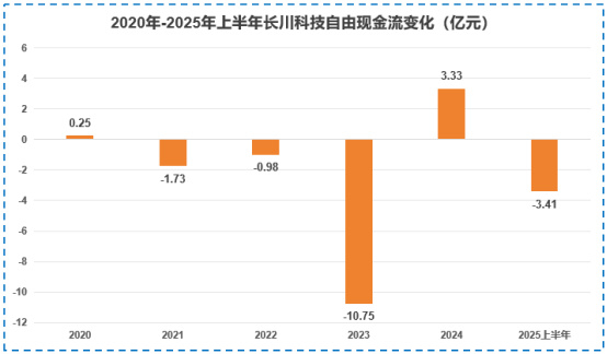 然而,研发费用的持续增长也在侵蚀长川科技的现金流。由于企业研发支出会直接影响经营性现金流,2020-2025年上半年,公司自由现金流基本为负,反映出资金流动性的一定压力。