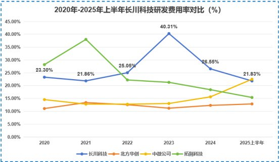 2020-2025年上半年,长川科技研发费用率始终维持在20%以上的较高水平,甚至超过北方华创、中微公司等行业龙头。2025年上半年,公司完成了一系列高端新品研发,测试机、分选机核心性能指标已达到国内领先、接近国际先进水平。