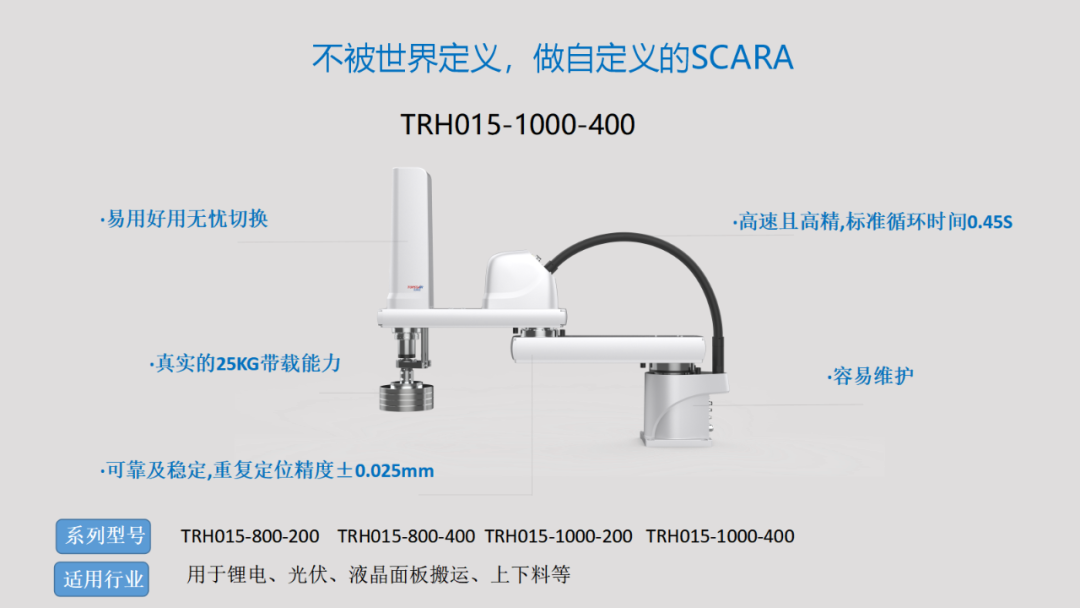 其中,TRH2系列通过升级迭代,产品型号从2款增加到5款,臂展从400mm/500mm,增加了300mm、600mm、700mm,来满足客户生产过程中对臂展的不同需求。