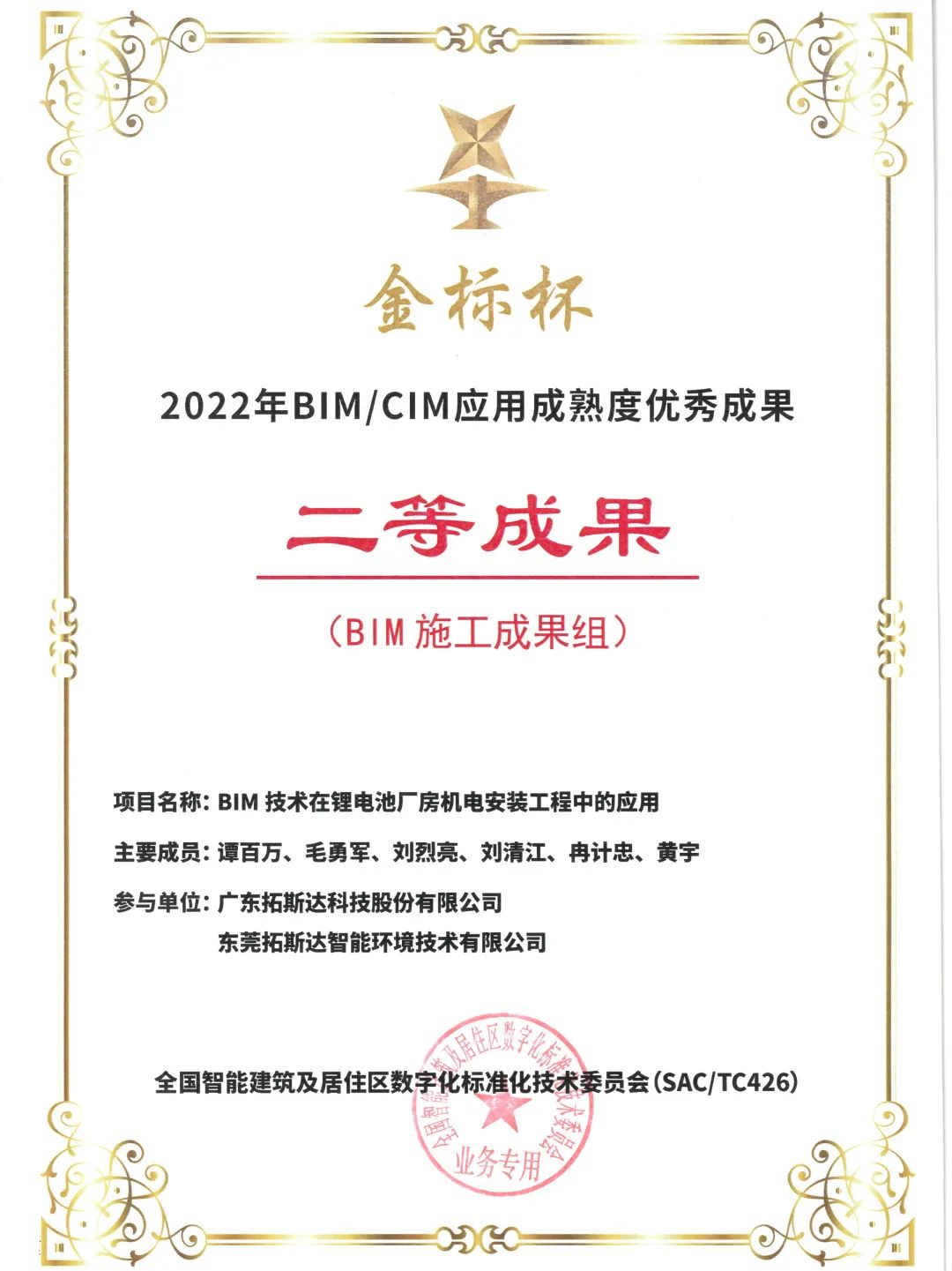 广东拓斯达科技股份有限公司全资子公司东莞拓斯达智能环境技术有限公司(下称:拓斯达BIM团队)提报的“BIM技术在锂电池厂房机电安装工程中的应用”参赛作品荣获BIM施工成果组二等成果。