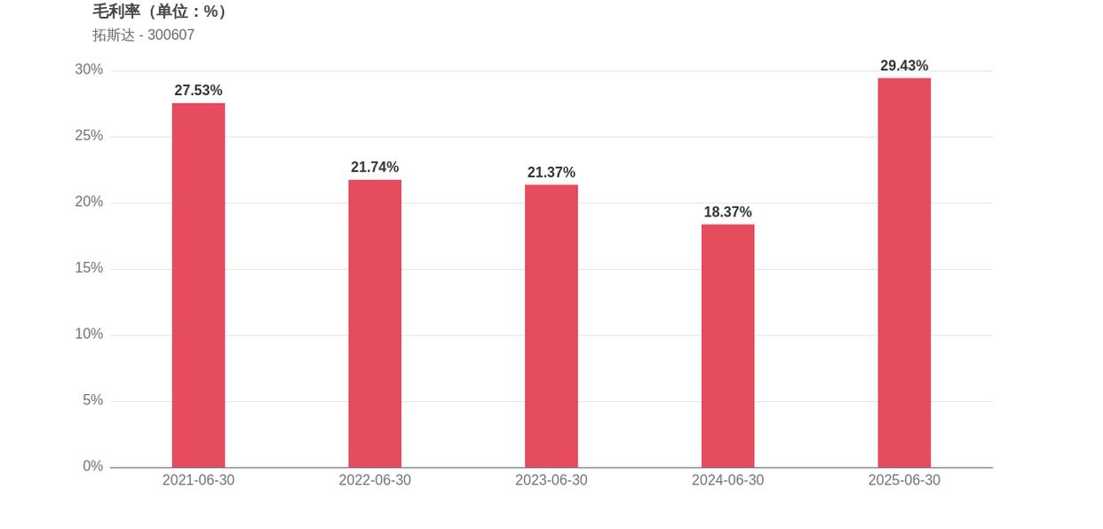 从反映盈利质量的指标来看,拓斯达表现出积极变化。净利率由2024年上半年的1.83%提升至2.90%,提升了1.07个百分点。毛利率从2024年上半年的18.37%提升至29.43%,上升了11.06个百分点。净资产收益率方面,2025年上半年为1.02%,同比下降了0.46个百分点,已连续5年同期下滑。
