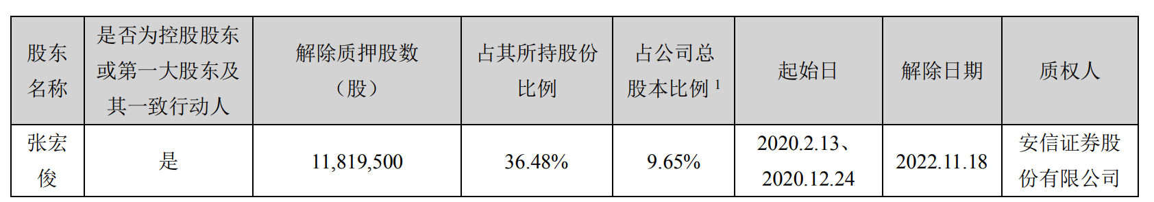 公告显示,汇纳科技近日接到公司控股股东、实际控制人张宏俊的通知,获悉张宏俊办理了股票质押式回购交易部分提前购回业务,其所持有汇纳科技的1181.95万股股份解除质押,占汇纳科总股本比例为9.65%。