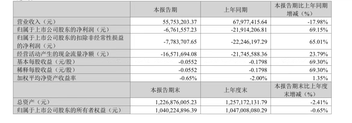根据公告,公司实现营业收入5575.32万元,同比减少17.98%;归属于上市公司股东的净利润-676.16万元,同比增长69.15%。