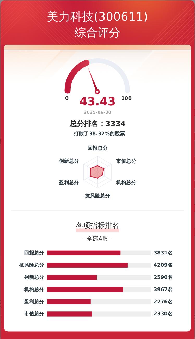上市公司研究院构建了一套上市公司韧性评价体系,从企业盈利、科技创新、股东回报、经营抗风险、市值表现及机构吸引力六个维度对企业进行量化评分,满分为100分。美力科技的韧性评价总分为43.43分,在A股5405家可比上市公司中排名第3334位。
