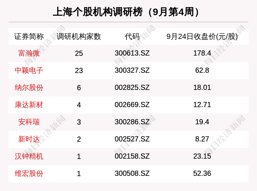 机构调研方面,据数据统计,9月第4周,有8家上海上市公司接受机构调研。其中,25家机构到访富瀚微,23家机构到访中颖电子,6家机构到访纳尔股份,4家机构到访康达新材,3家机构到访安科瑞。