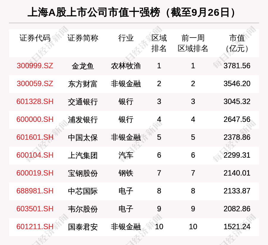截至9月26日,上海板块市值最大的是金龙鱼,市值最小的是ST龙韵。上周市值增长最多的是中国船舶,增长135.96亿元;市值缩水最多的是宝钢股份,缩水187.06亿元。