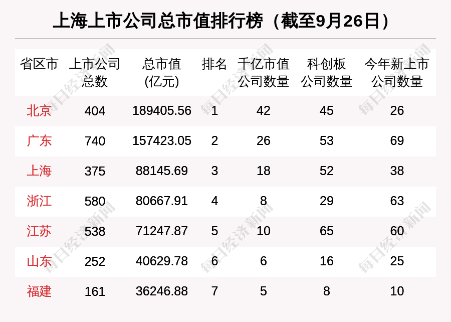 市值方面,截至2021年9月26日,上海板块总市值为88145.69亿元,较前一周87955.74亿元,增长0.22%(加权平均)。
