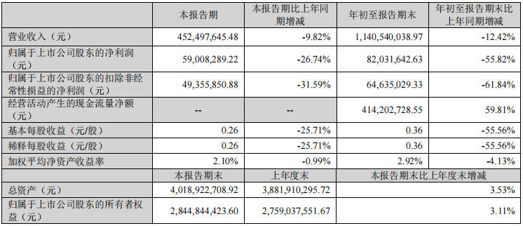 从年初至报告期末(2025年1-9月),公司累计营业收入11.41亿元,同比下降12.42%;累计归属于上市公司股东的净利润8203.16万元,同比下降55.82%;累计归属于上市公司股东的扣除非经常性损益的净利润6463.5万元,同比下降61.84%;基本每股收益0.36元/股,同比下降55.56%;加权平均净资产收益率2.92%,较上年同期减少4.13个百分点。