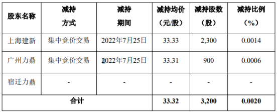 公告显示,减持前上海建新、广州力鼎分别持有公司股份4,093,781股、2,046,891股,分别占公司普通股总股本2.5517%、1.2758%,本次减持后分别持有股份4,091,481股、2,045,991股,分别占公司普通股总股本比例为2.5503%、1.2753%。