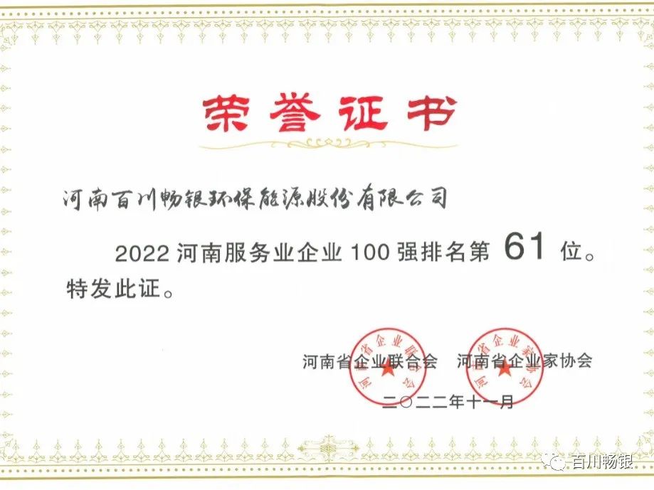 河南省企业联合会、河南省企业家协会通过官方网站发布了2022河南企业100强、2022河南制造业企业100强、2022河南服务业企业100强榜单。河南百川畅银环保能源股份有限公司在“2022河南服务业企业100强”榜单位列61。作为沼气发电行业细分领域填埋气发电的标杆企业,百川畅银凭借多年来在行业内技术能力创新、品牌影响力、业主满意度及信息化发展等多维度的优异表现,荣膺2022年河南服务业企业100强。