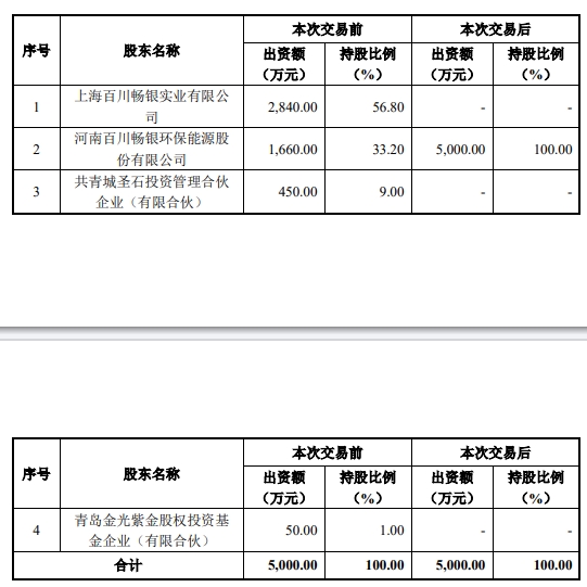 本次交易前,百川畅银持有百川环服33.20%的股权;交易完成后,百川环服将成为公司全资子公司并纳入公司合并报表范围。