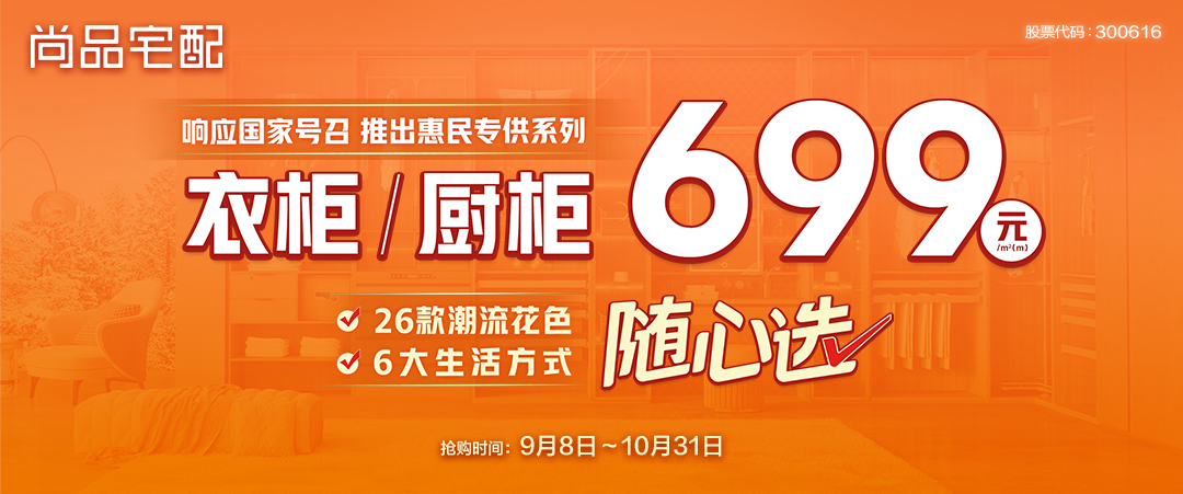 头部企业更是落地了一系列实质性、吸引力强的营销活动。以定制家居龙头企业尚品宅配为例,双节前夕,尚品宅配发布699惠民专供系列及AiLife6系列。其中699系列包括699元/㎡的衣柜、699元/m的厨柜,优选环保健康板材、加厚背板及优质五金配件,并提出“先设计,后消费”模式。仅在发布会当日,尚品宅配当天销售额已超1500万元。据悉,尚品宅配近日打响年底抢单战役,借助699惠民系列,全国多个门店国庆销售节节攀升,屡创业绩新高。