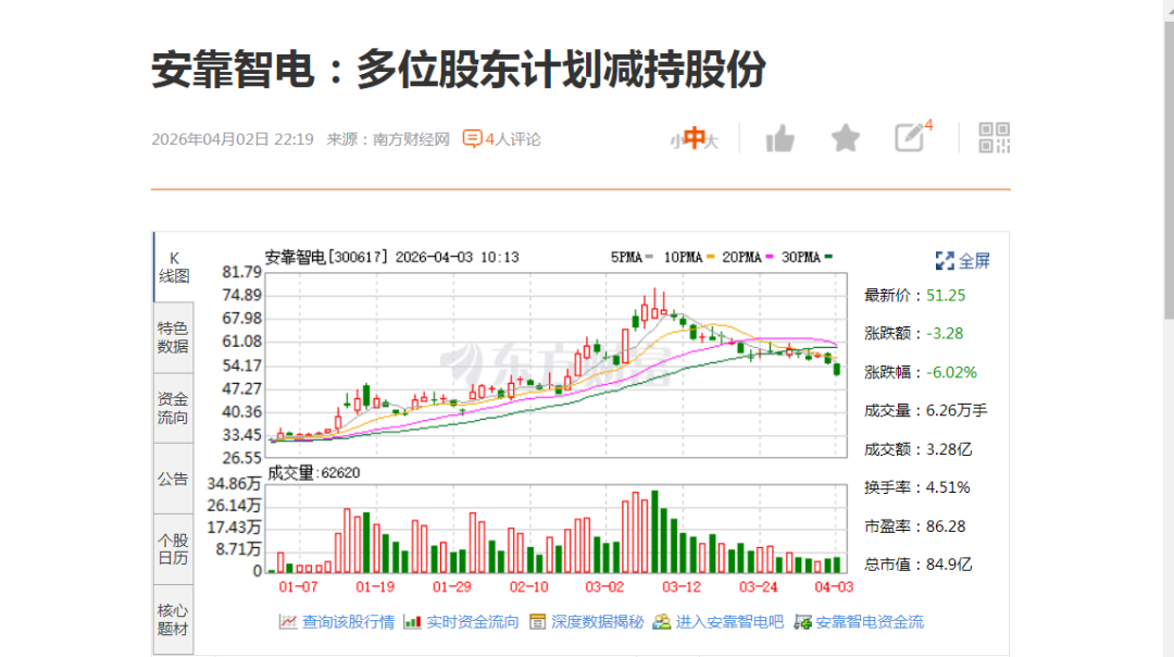 4月2日,安靠智电发布公告:实际控制人陈晓凌计划在2026年4月24日至7月23日期间,通过大宗交易或竞价交易方式减持不超过331.41万股,占总股本2%;董事王春梅拟减持不超过1.86万股,占总股本0.01%,合计2.01%。