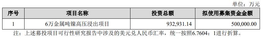 寒锐钴业2023年7月28日发布的2023年度向特定对象发行A股股票预案(修订稿)显示,本次向特定对象发行股票募集资金总额不超过500,000.00万元(含本数),并以中国证监会关于本次发行的同意注册文件为准。本次募投项目的实施主体为公司控股子公司印尼寒锐镍钴有限公司,该子公司由公司实际控制,持股比例为70%。本次发行的募集资金在扣除发行费用后,将用于6万金属吨镍高压浸出项目。
