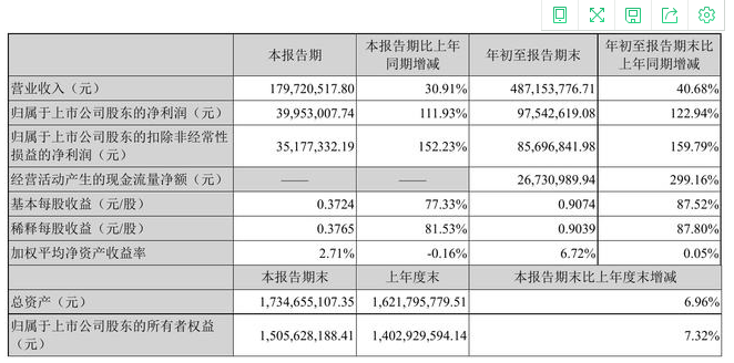 2021年前三季营收与净利同比大幅增长,光库科技表示,主因系公司技术创新、推出新产品、积极开发国内外新客户。其中在第三季度,公司营收1.8亿元,同比上升30.9%;归母净利润3995万元,同比上升111.9%。