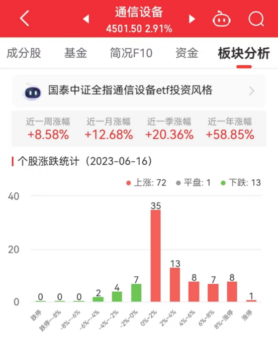 中国经济网北京6月16日讯今日,通信设备板块整体涨幅2.91%,其中72只股票上涨,1只股票平盘,13只股票下跌。