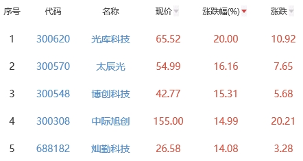 其中,光库科技、太辰光、博创科技、中际旭创、灿勤科技位列板块涨幅前五位,涨幅分别为20.00%、16.16%、15.31%、14.99%、14.08%。