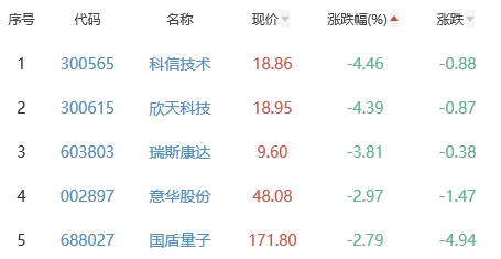 科信技术、欣天科技、瑞斯康达、意华股份、国盾量子位列涨幅榜后五位,涨幅分别为-4.46%、-4.39%、-3.81%、-2.97%、-2.79%。